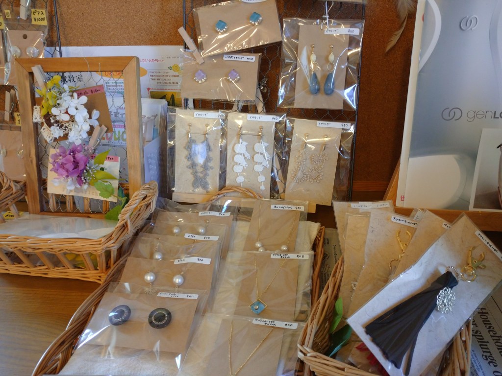 コットンパールやレース・カラータイルに細工をほどこしたアクセサリーや、皮ひものタッセルは