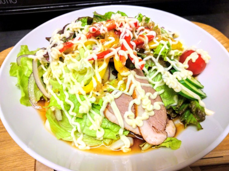 サラダうどん。冷たいうどんの上にたっぷりの新鮮野菜と合鴨のスモークロース。